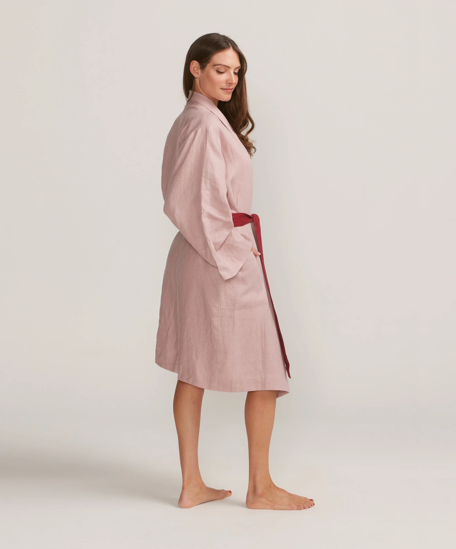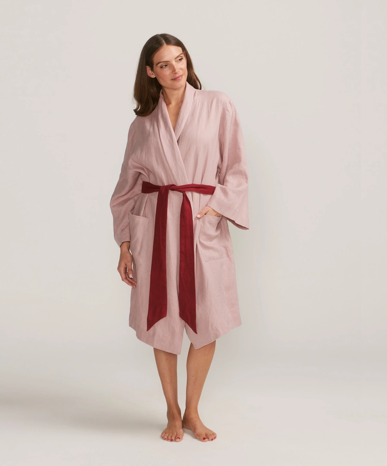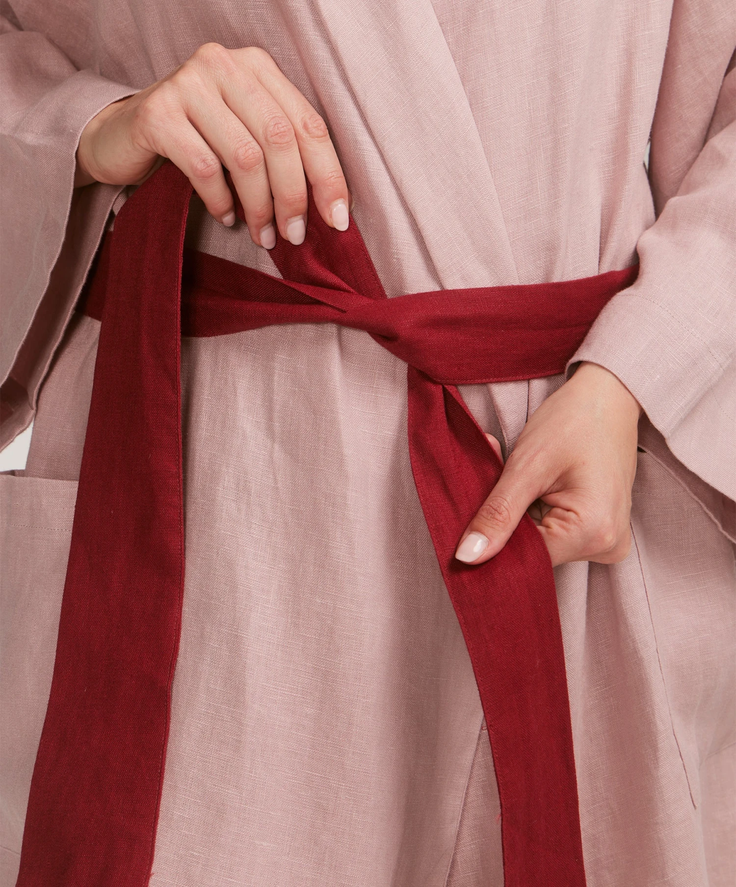 Designed to become part of your daily rituals. Our luxurious linen robe features a convenient contrasting sewn-in waist tie, extra wide sleeves and spacious pockets. Made from OEKO-TEX® certified linen and available in two sizes. Our model is wearing the S/M size.