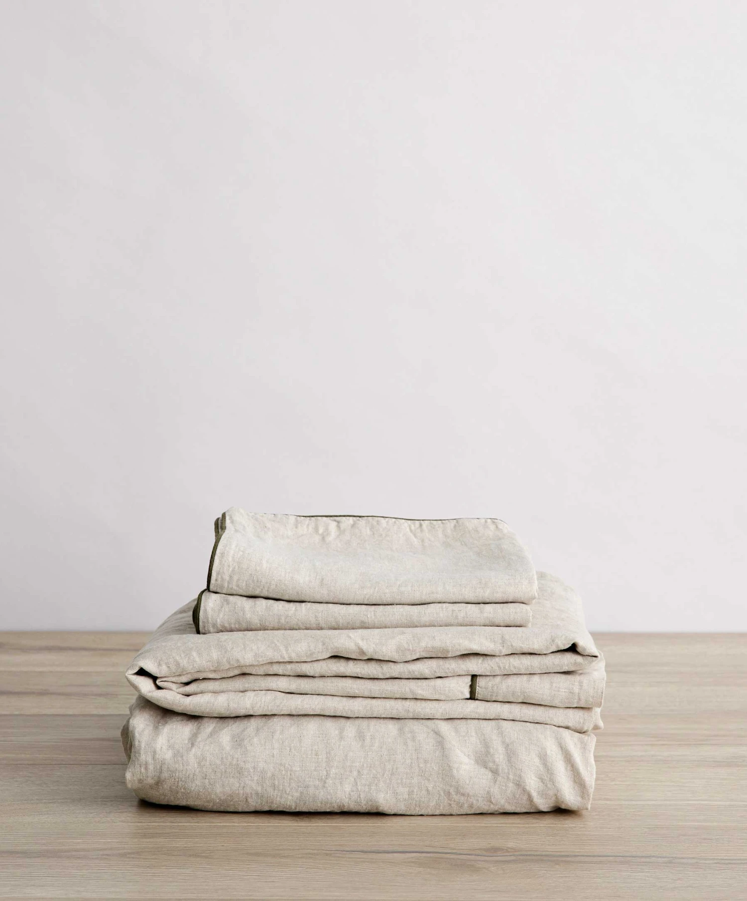 Piped Linen Sheet Set With Pillowcases – Natural And Forest